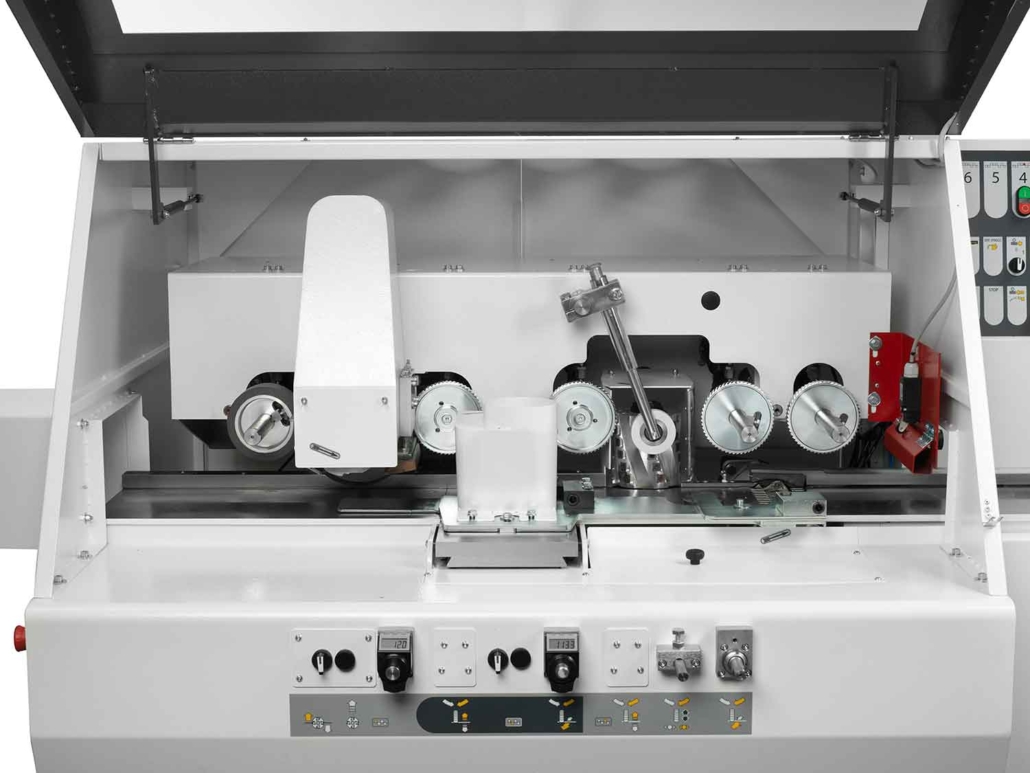 • Traverse supérieure motorisée avec rouleaux d’entraînement et presseurs réglables simultanément à l’arbre supérieur