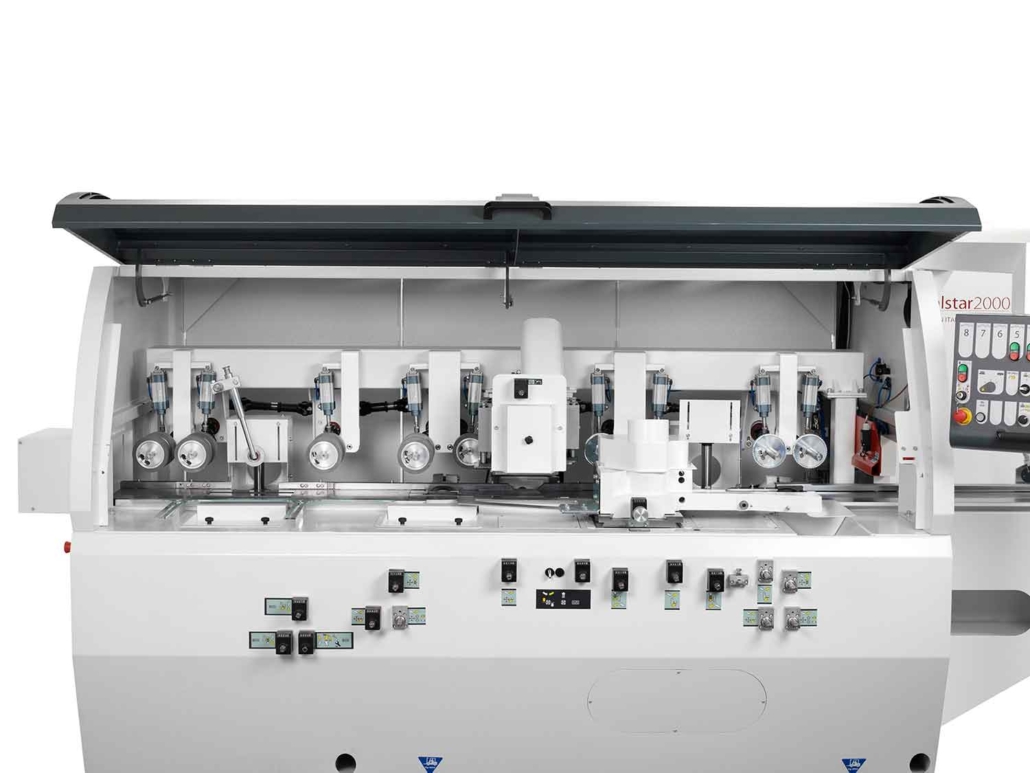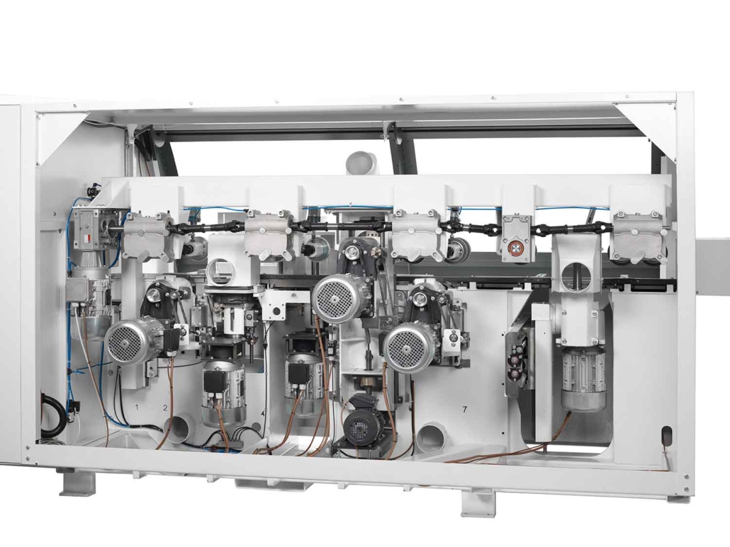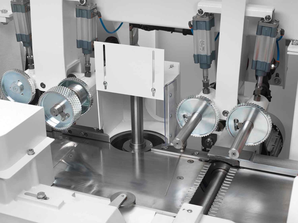 - Traverse supérieure motorisée sur guidages linéaires à recirculation de billes, avec rouleaux d’entraînement et presseurs réglables simultanément à l’arbre supérieur