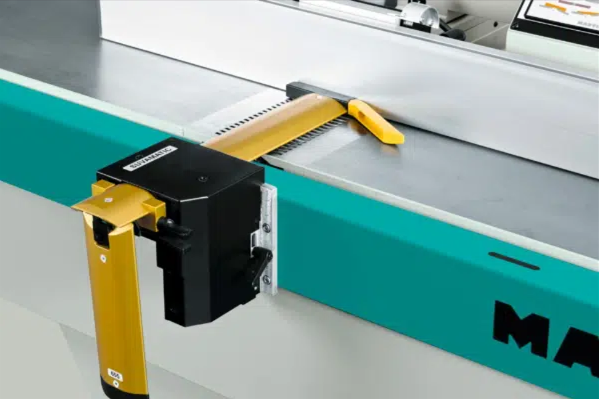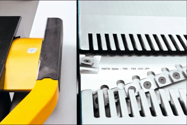 Guide de dégauchissage : inclinable jusqu’à 45° (échelle graduée, commande par levier et guide auxiliaire)